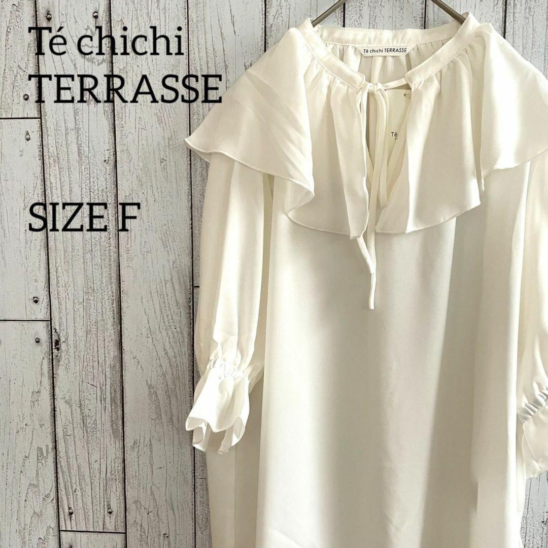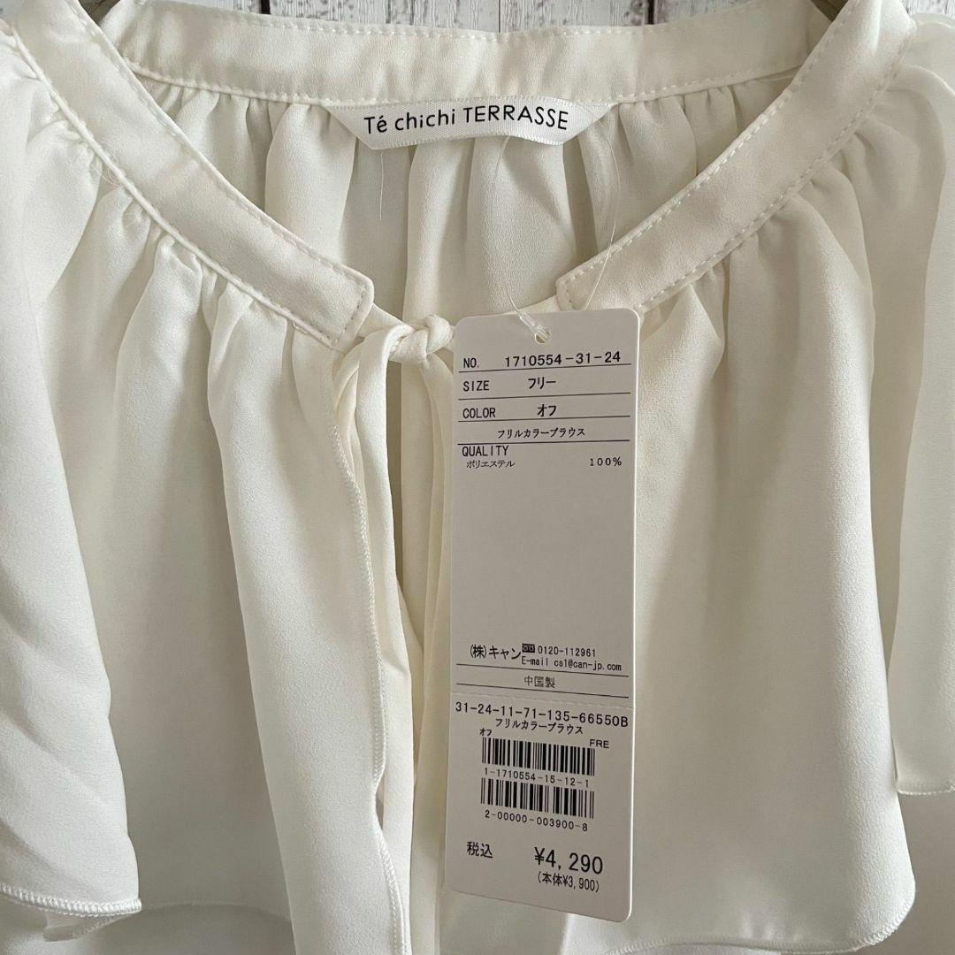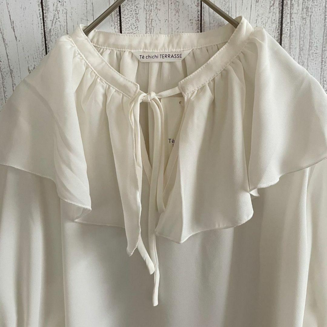 テチチテラス(Té chichi •TERRASSE)のフリルカラーブラウスです。新品未使用のタグ付きになります。フリルとリボンがポイントの可愛らしい一枚。ボトムスを選ばず幅広く着回しの効く優秀アイテムで、普段使い、きれいめ、フォーマルと様々なシーンでご利用いただけます。