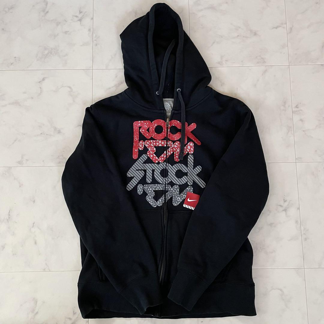 ナイキ(NIKE)のヴィンテージフード付きジップアップパーカーです。胸に赤色の「ROCK」などの文字がプリントされており、色合いともに幅広いコーディネートにも着まわしできる1枚です。