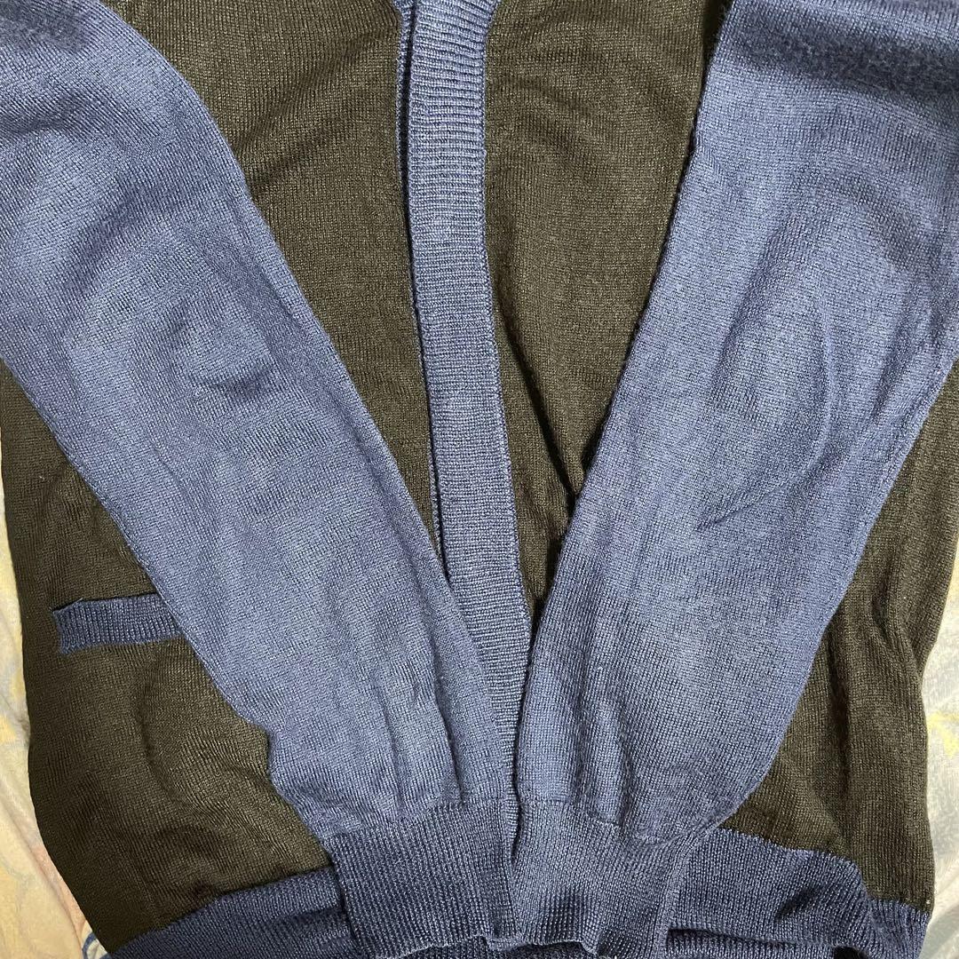 GU(ジーユー)の長袖カーディガンです。青と黒の配色がオシャレな一枚。レディース、メンズともに着用いただけます。採寸の方よくご確認の上お願いいたします。
