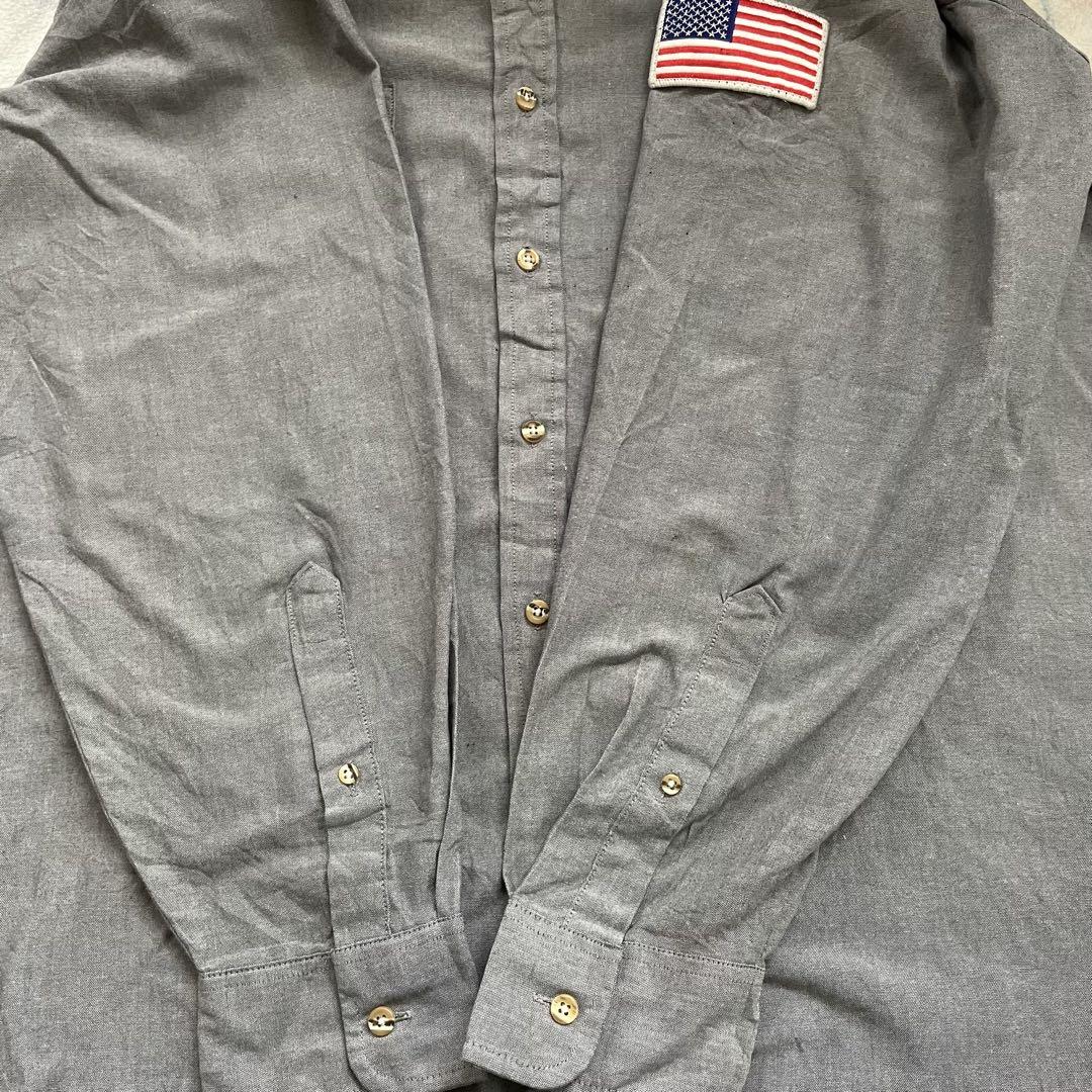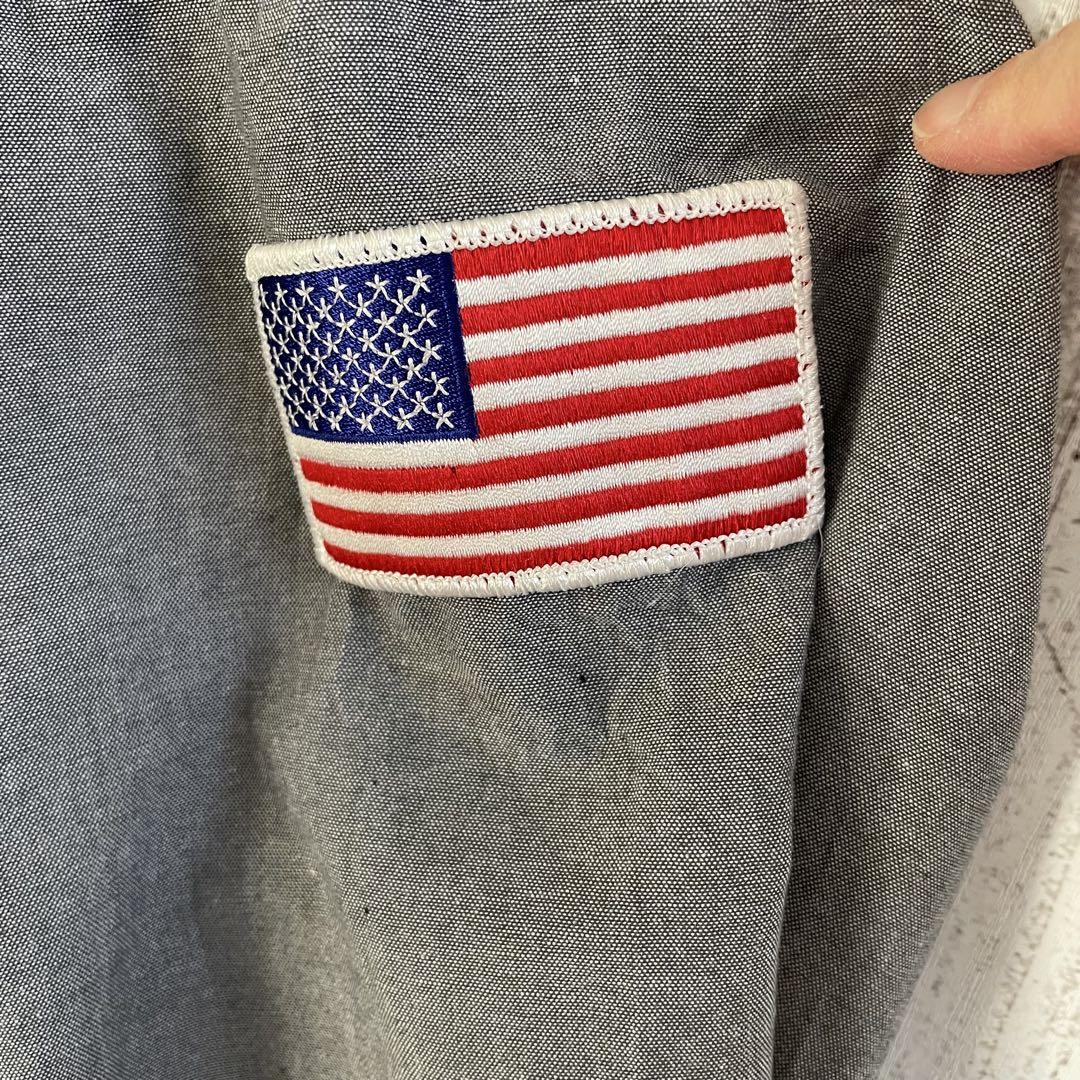 RIVERSIDEの長袖ワークシャツです。胸に刺繍、肩にアメリカ国旗のワッペンがついています。アメカジ、スケーター、ストリート好きな方にオススメです!