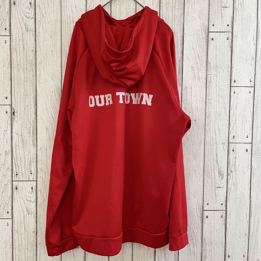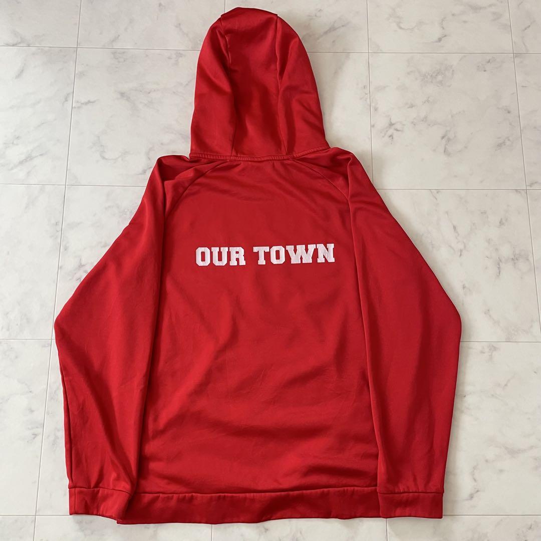ナイキ(NIKE)DRI-FIT(ドライフィット)のフード付き長袖パーカーです。胸のプリントがオシャレな一枚。背中にも「OUR TOWN」のプリントがはいっています。
