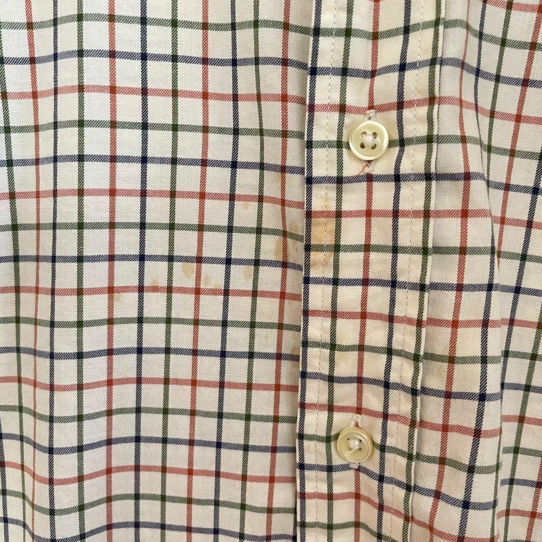 前側真ん中あたり、袖口付近に茶色のシミがみられます。あとは古着の使用感もありますので、写真の方をよくご確認の上お願いいたします。