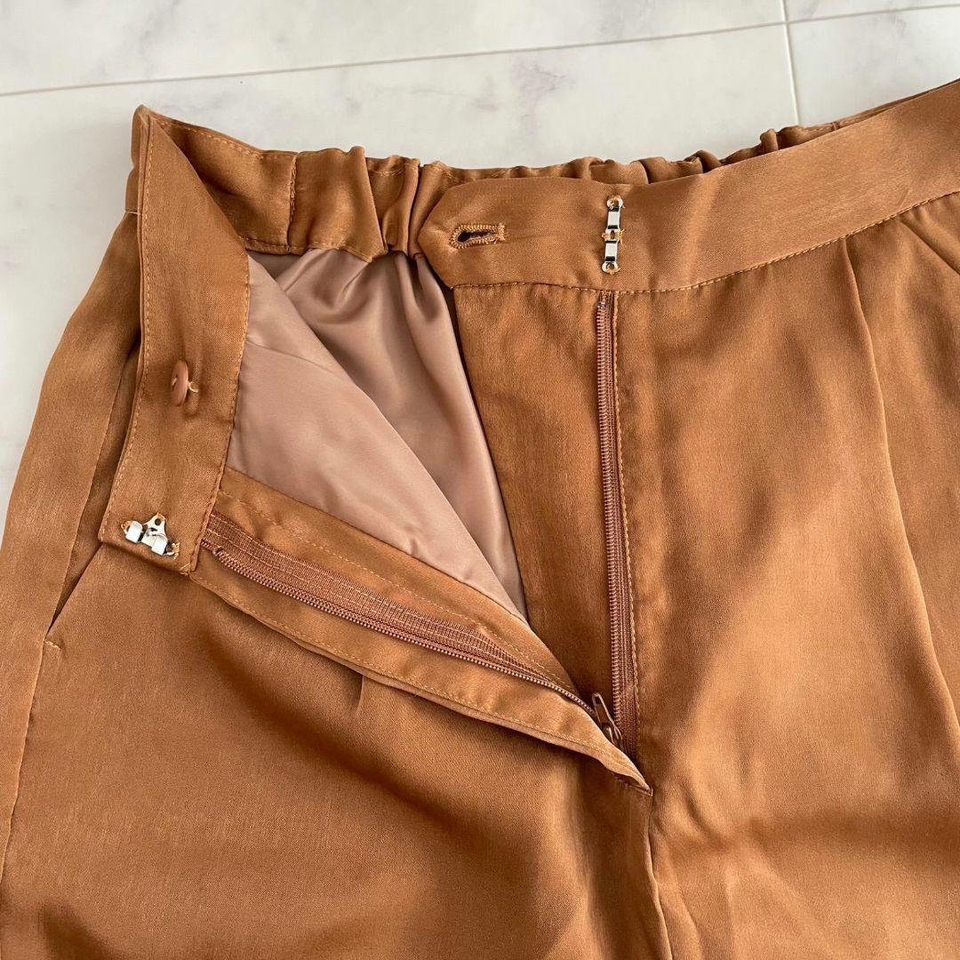 ビームス(BEAMS )のサテンフレア裾スリットパンツです。新品未使用のタグ付きになります。ブラウンの色味が、カジュアル、きれいめなど様々なコーデにあわせすく、使いやすい一枚です。