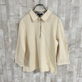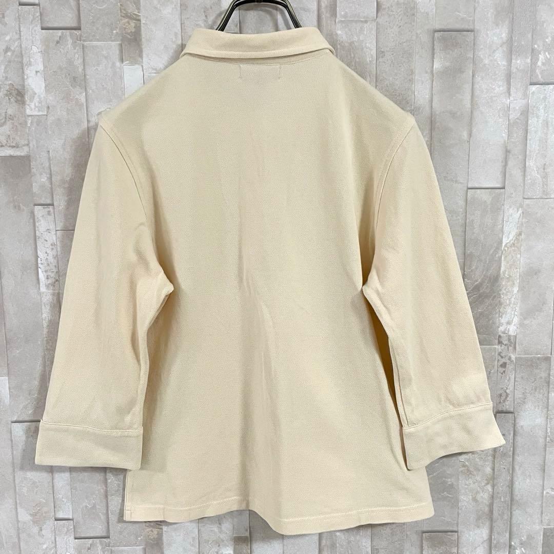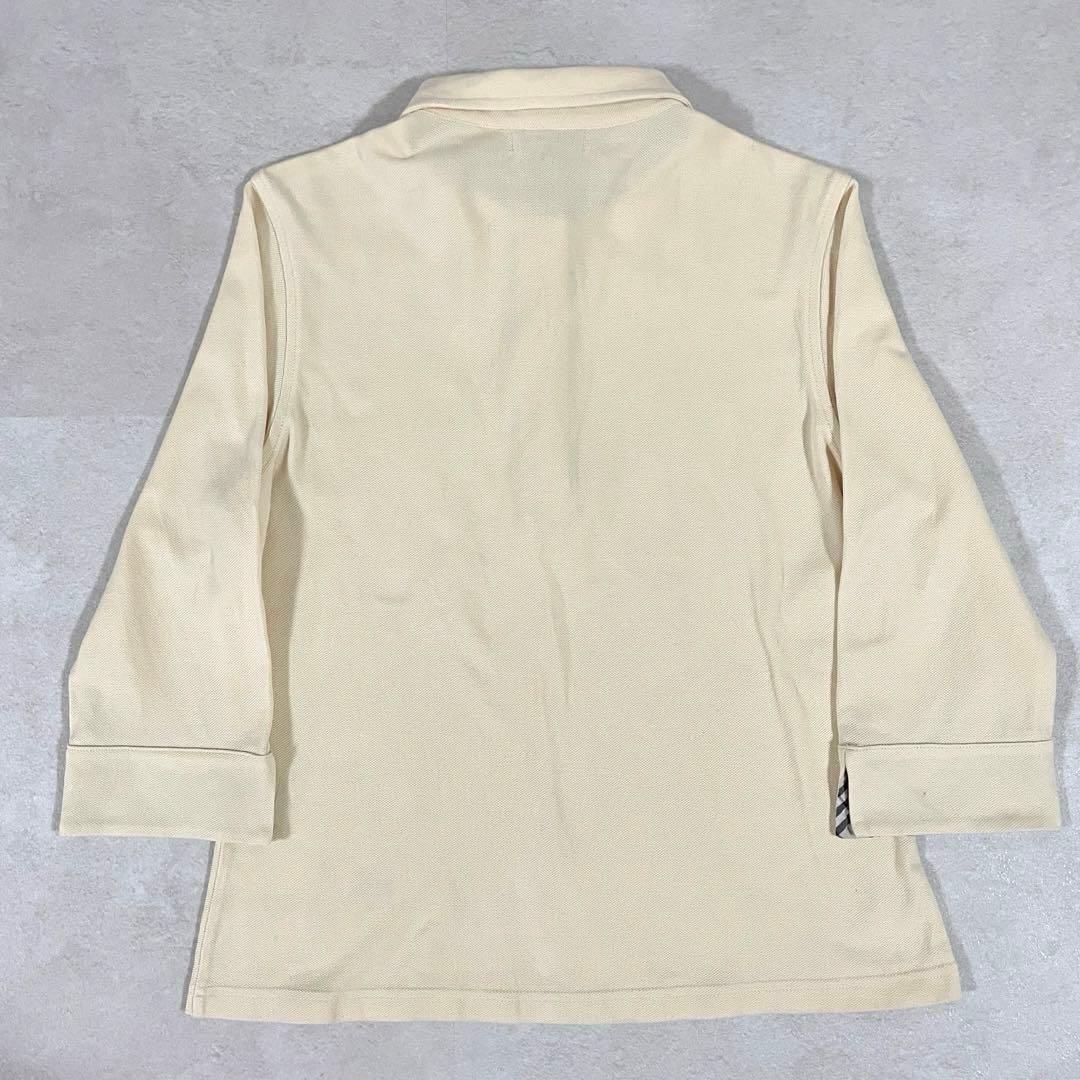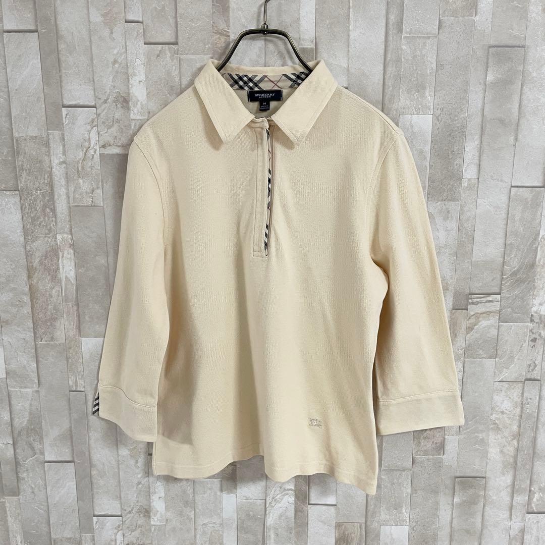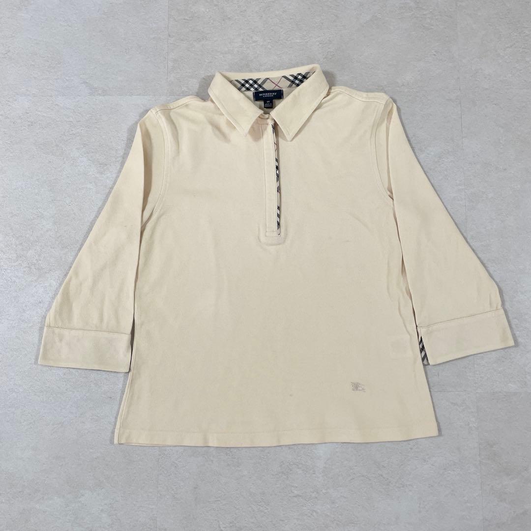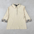 BURBERRY LONDON (バーバリーロンドン)の七分袖ポロシャツです。ベージュ生地の左裾にロゴ刺繍、襟、ファスナー、袖裏にバーバリーチェックが施された商品。袖口を折り返したり、ハーフジップ仕様なので調整しやすい首元など、気分に合わせて楽しめる1枚。採寸の方をよくご確認ください。