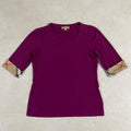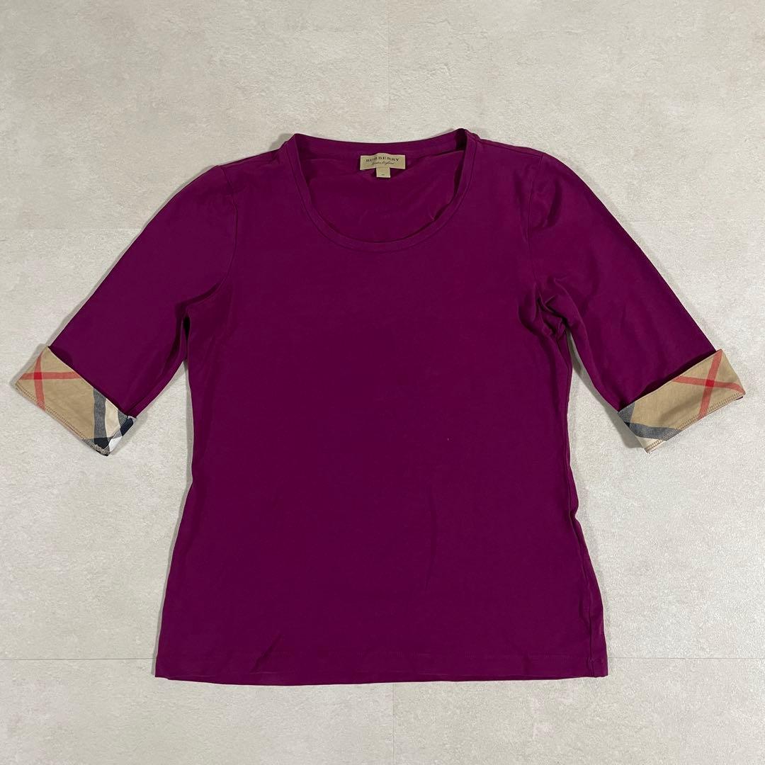 BURBERRY(バーバリー)のTシャツです。パープル生地に両腕袖口にはバーバリーチェック柄が施されたオシャレなデザイン。採寸の方をよくご確認ください。