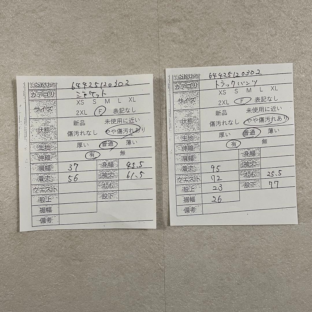 首周りに黄ばみ、左袖後面に汚れ(添付写真6枚目参照)、ウエストの表裏、両裾のライン部分に汚れ(10枚目)があります。その他古着の使用感はありますので、写真の方をよくご確認ください。 |