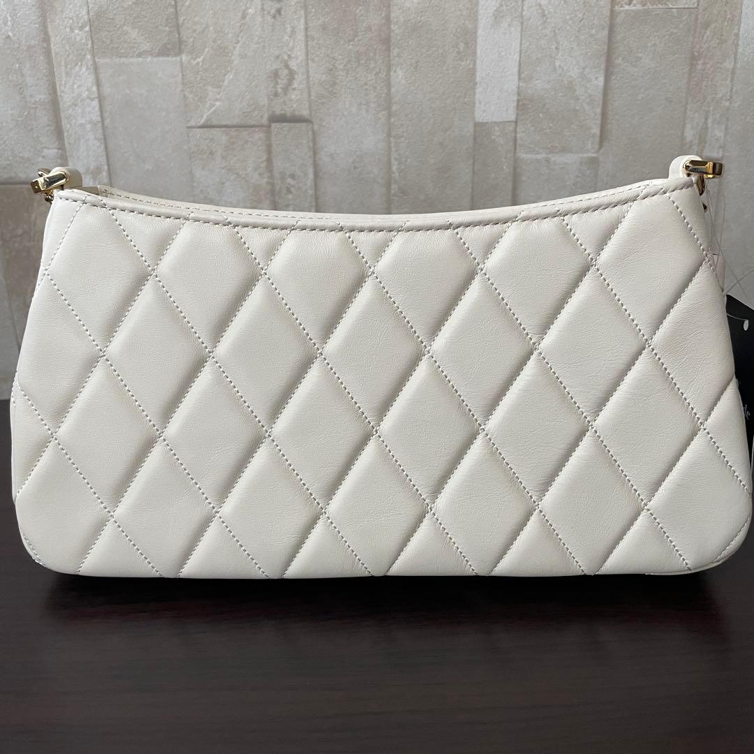 キルティング無地レザーにロゴ金具がオシャレなショルダーバッグです。ファスナー開閉で二つ折り財布も入り、小物整理に便利なポケット付き。取り外し可能なショルダーは斜め掛けでもワンショルダーでもお使い頂ける2way。普段使いからパーティーシーンなどマルチに大活躍です
