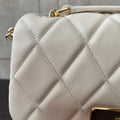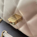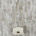 ホワイトのキルティング無地レザーにロゴプレートがオシャレなkate spade(ケイトスペード)のショルダーバッグです。ターンロック開閉で二つ折り財布も入り、内側/背面にも便利なポケット付き。斜め掛けできるショルダーは2段階調節可能な2way。普段使いからパーティーシーンなどマルチに大活躍です。