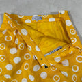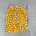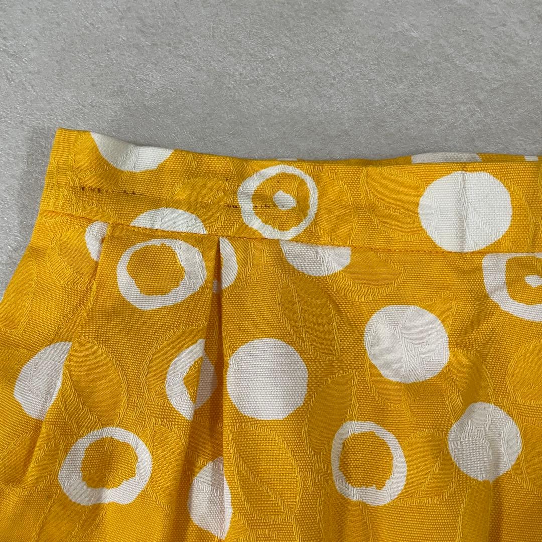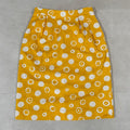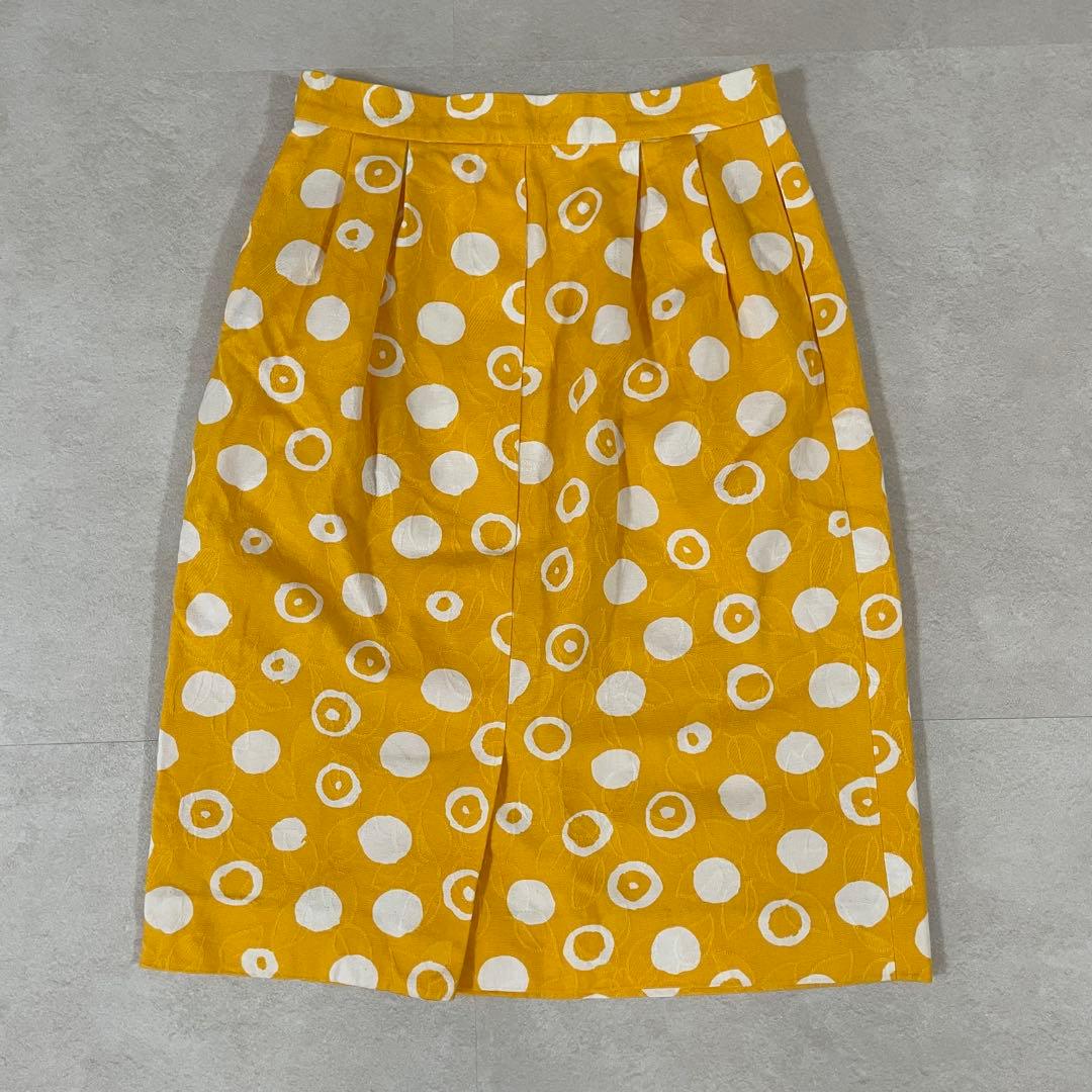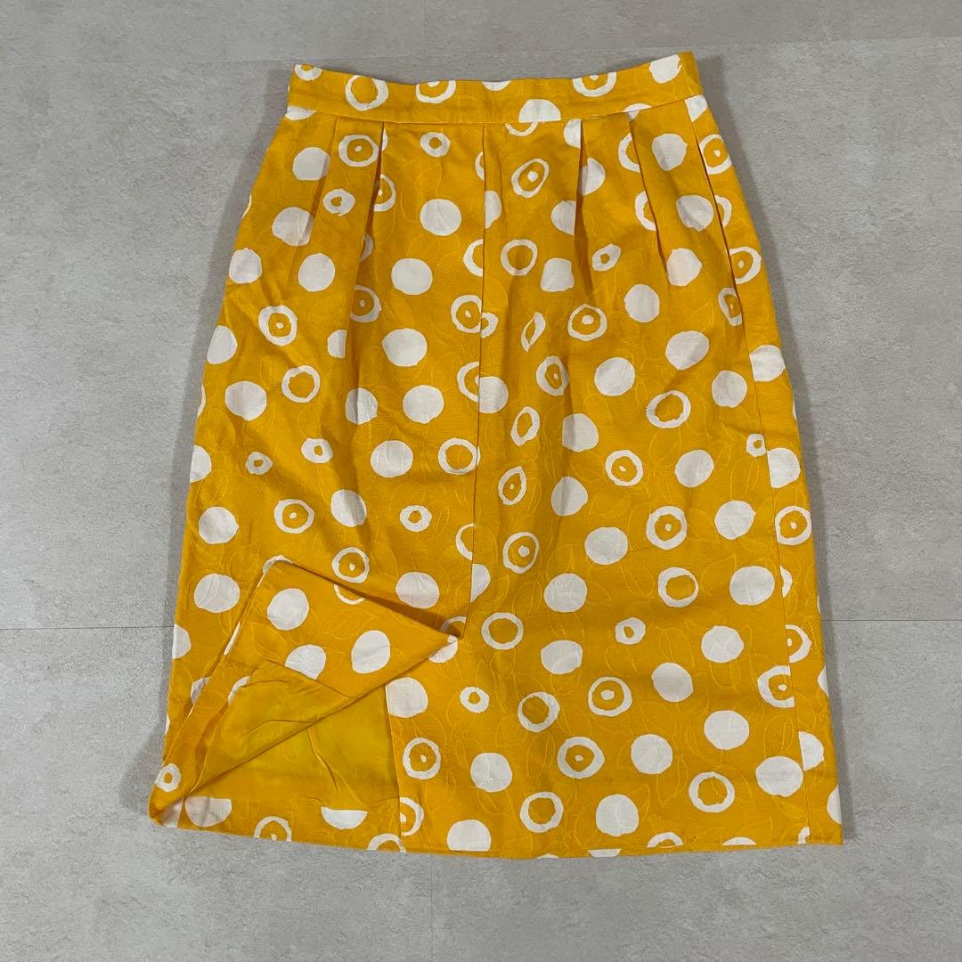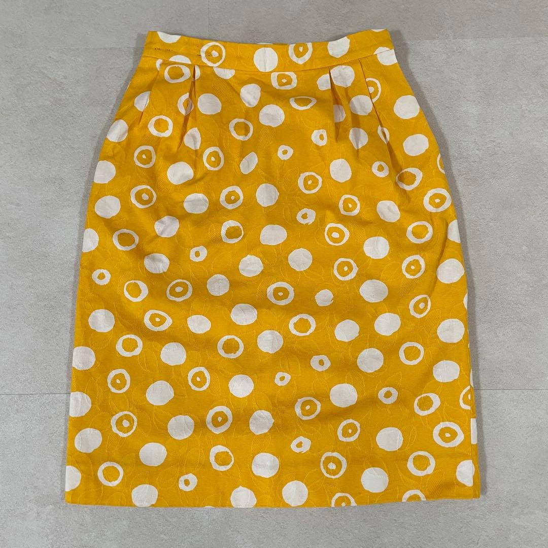 YVES SAINT LAURENT(イヴサンローラン)の膝丈スカートです。イエロー生地にドット柄が特徴的なオシャレなデザイン。ツータック、タイト仕様でスリットが施されています。「イヴサンローラン」時代の製品であり、2002年に創業デザイナーが引退し、オートクチュール部門が閉鎖される前のものです。現行の「サンローラン」とは異なる時代の製品であるため、流通量が限られています。採寸の方をよくご確認ください。
